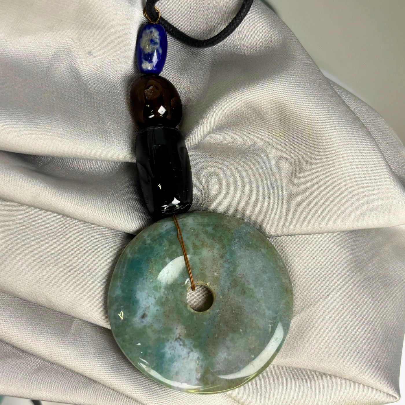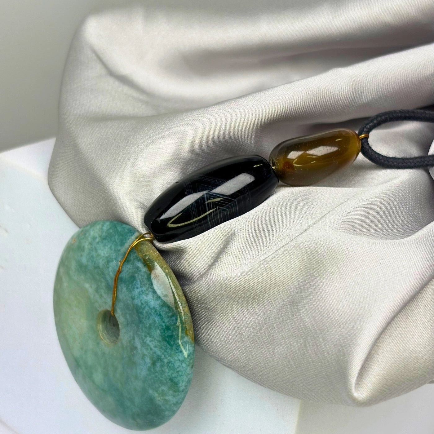Forest Oracle channels ancient forest wisdom — steady, intuitive, and quietly protective. The amazonite donut at its center brings calm to emotional turbulence and opens the heart to clearer expression. Tiger’s eye adds grounded strength and sharp focus, stabilizing your intentions. The deep black onyx bead anchors the piece, absorbing negativity and enhancing emotional resilience. A finishing touch of lapis lazuli introduces wisdom and clarity of thought.