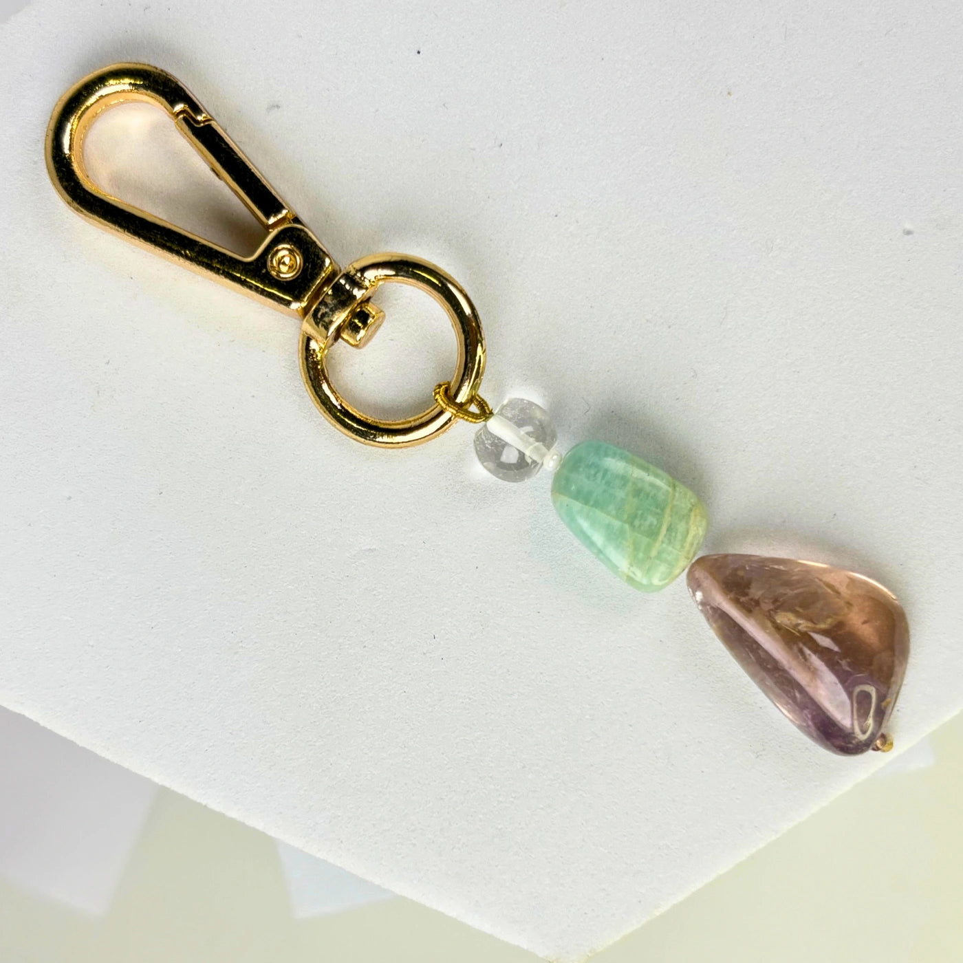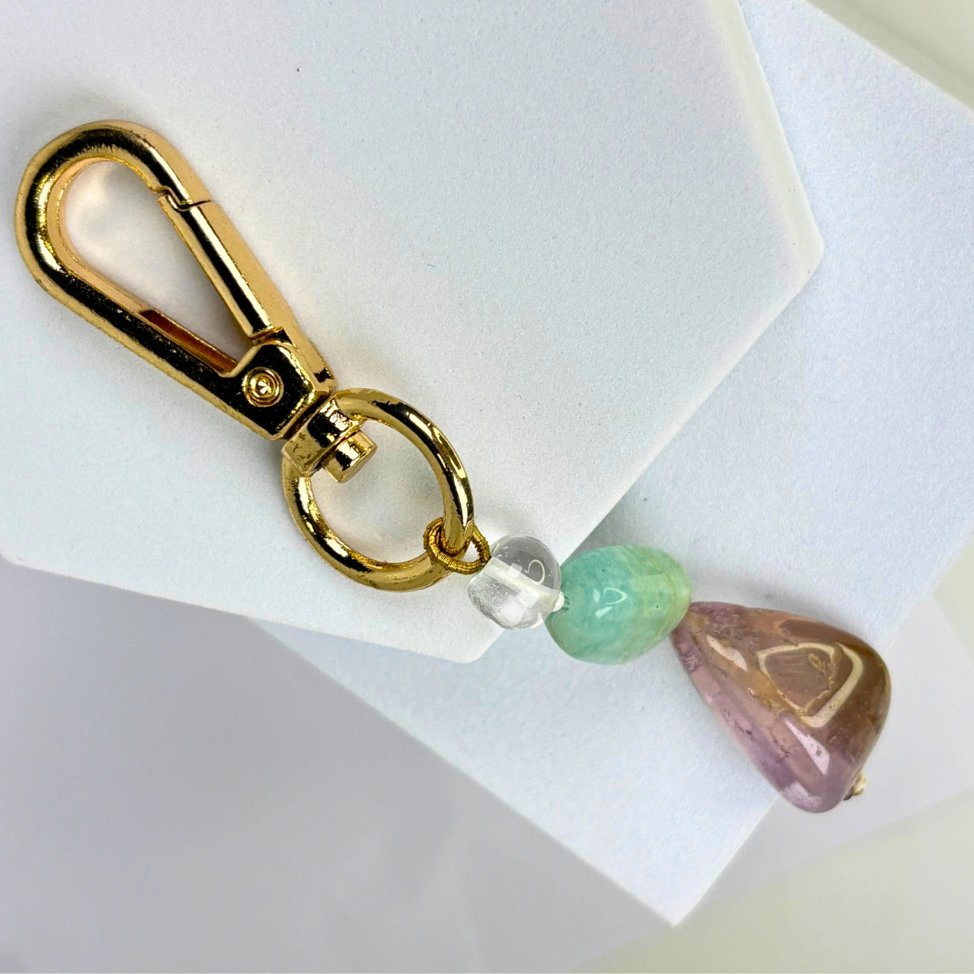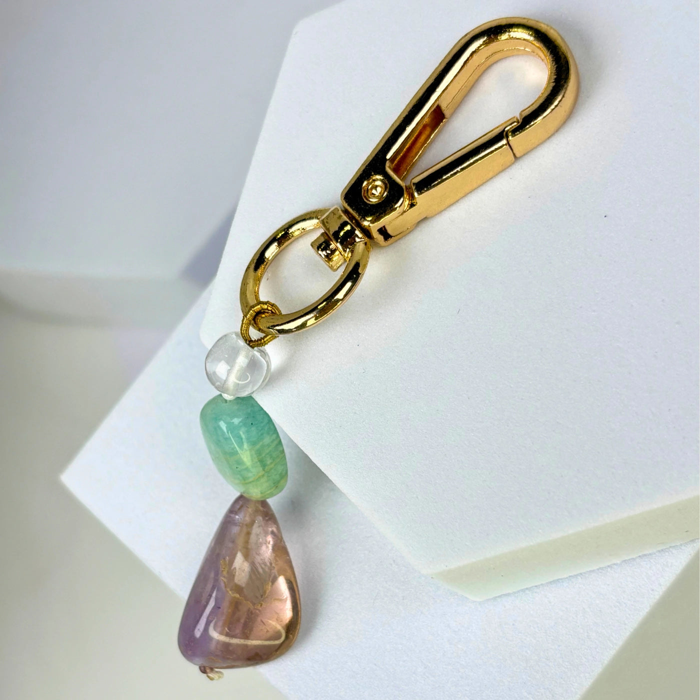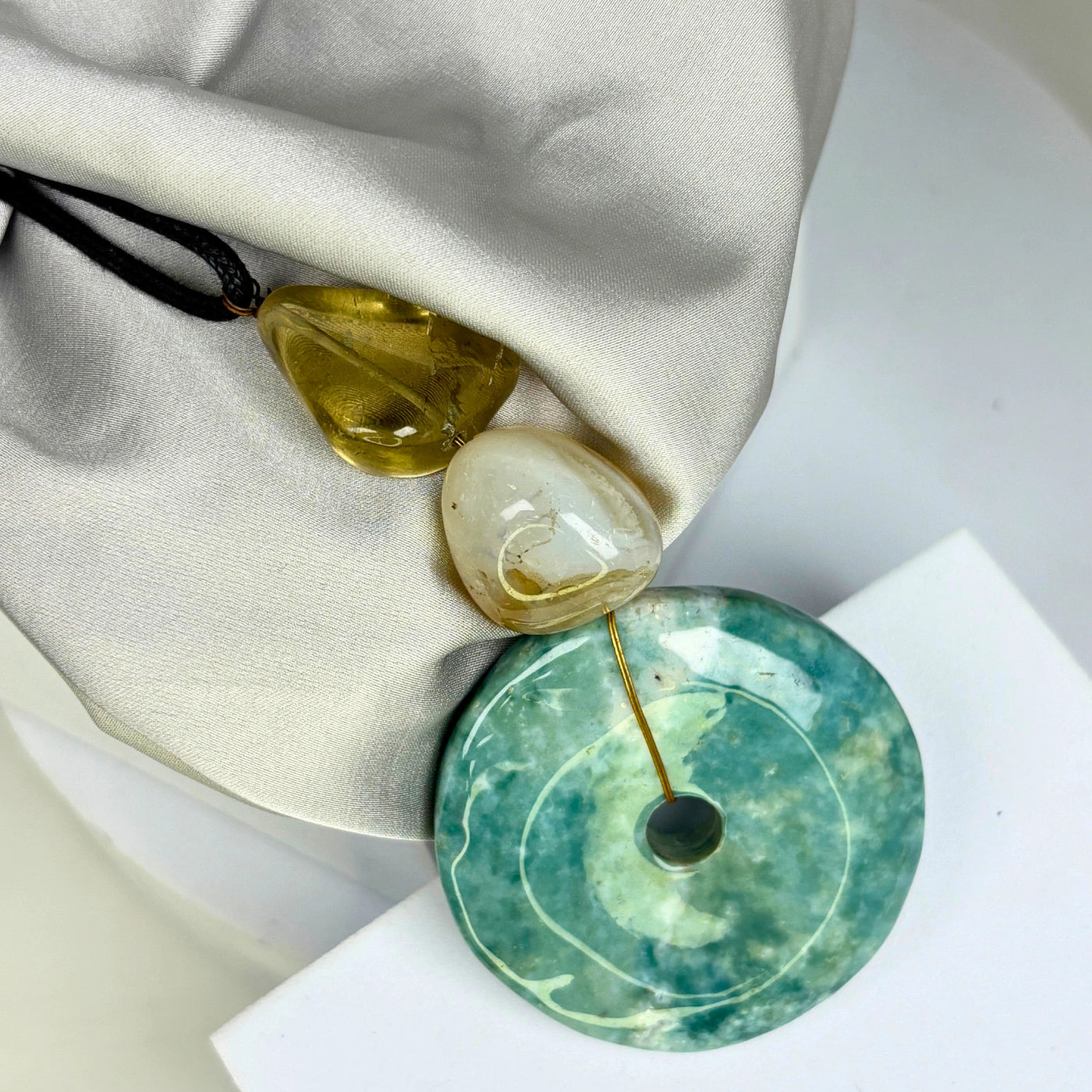 Sunlit Current features a natural amazonite donut pendant, known for its calming, heart-opening energy and soft, water-like patterns. It is paired with jade, a stone of harmony and prosperity, and finished with a clear quartz bead — a universal amplifier that enhances clarity and intention.