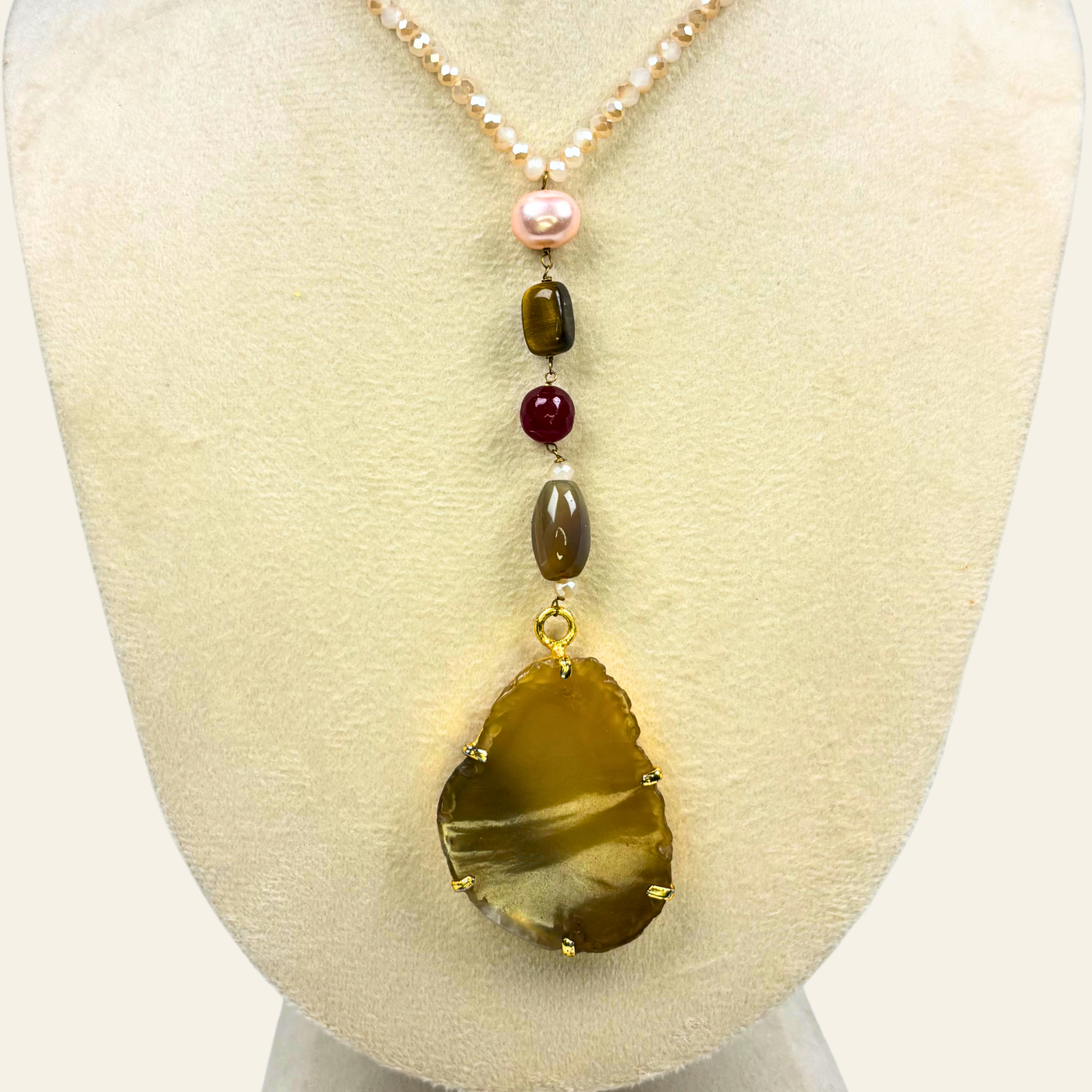 Golden Pulse radiates the confident, sunlit energy of tiger’s eye — a stone of courage, willpower, and clear decision-making. Its warm, silky bands are balanced with complementary beads that enhances the overall look and feel of the necklace. This design makes for a bold statement piece, perfect for all occasions.
