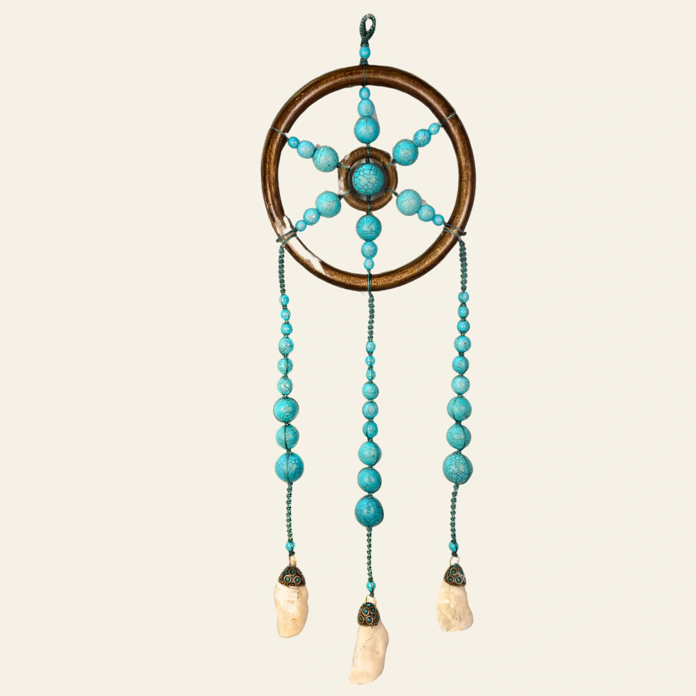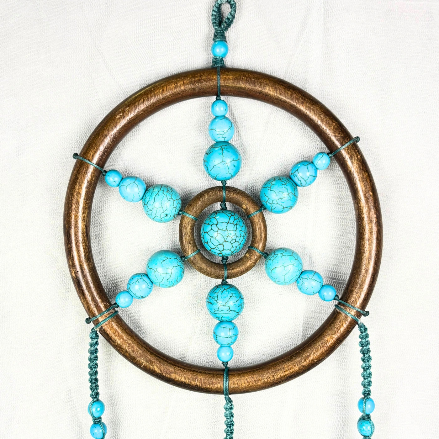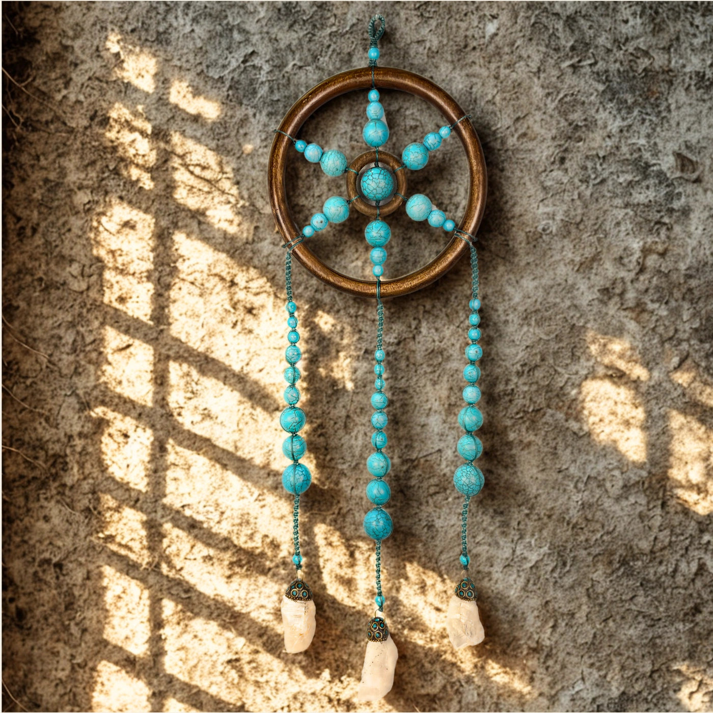 The Turquoise Wall Hanging has a delicate teal blue thread work and is approximately 18.5 inches in length and weighs 396 grams. There are raw crystal hangings at the end of each wall hanging to enhance the overall look. This piece has Crystal Quartz as the raw crystal ends.