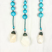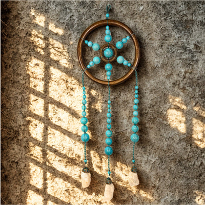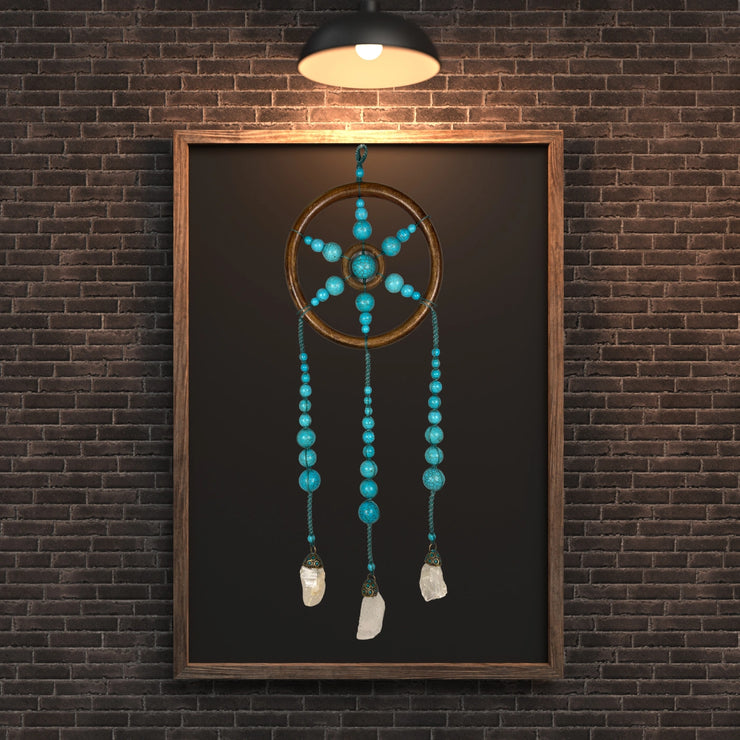 Add a pop of colour with our latest Turquoise Wall Hanging. A truly unique piece, it is hand crafted and made with Turquoise and raw Crystal Quartz stones.