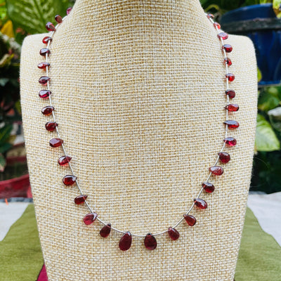 The newest sensation in town, Garnet Droplet necklace. A truly unique piece, it is hand crafted with Garnet stones with a silver 's' lock.