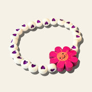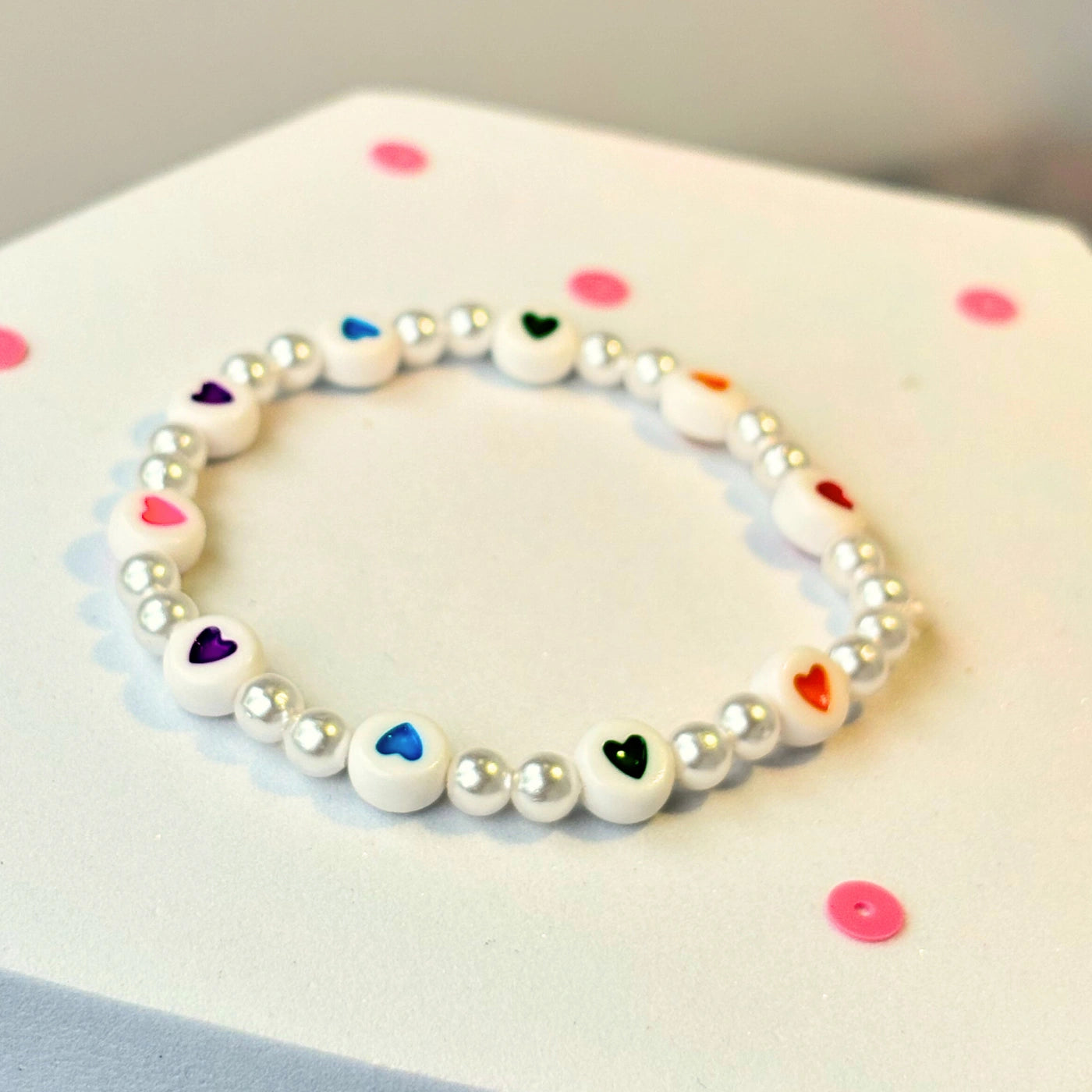 Bring on the colour! This bracelet is made of flat and round acrylic beads in a full rainbow of colours — each bead printed with a tiny heart in the center. Bright, cheerful and impossible to miss!