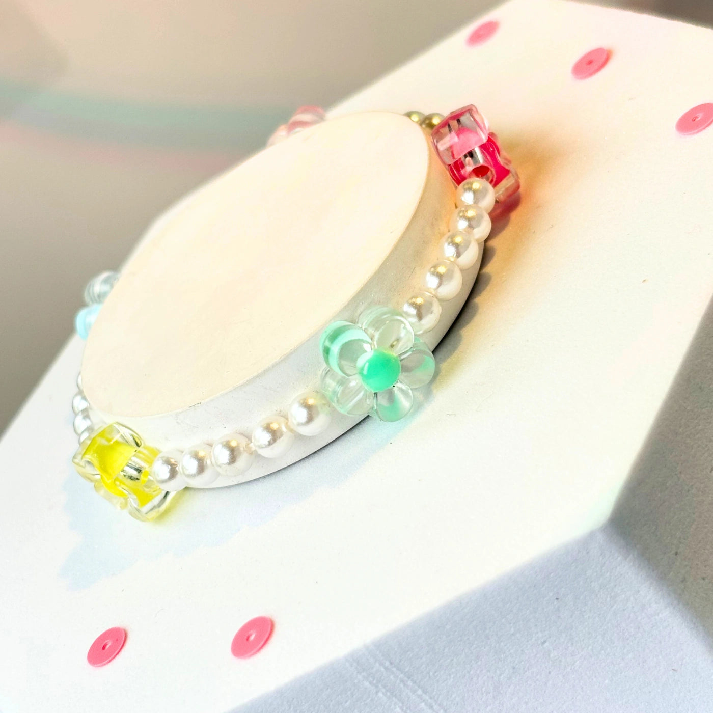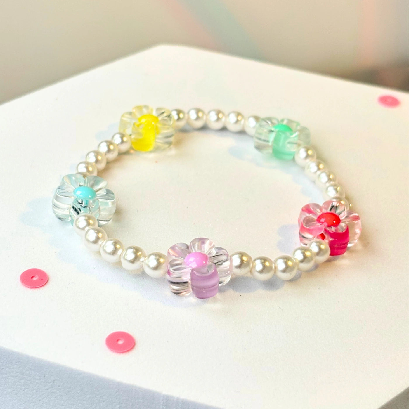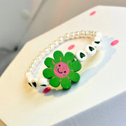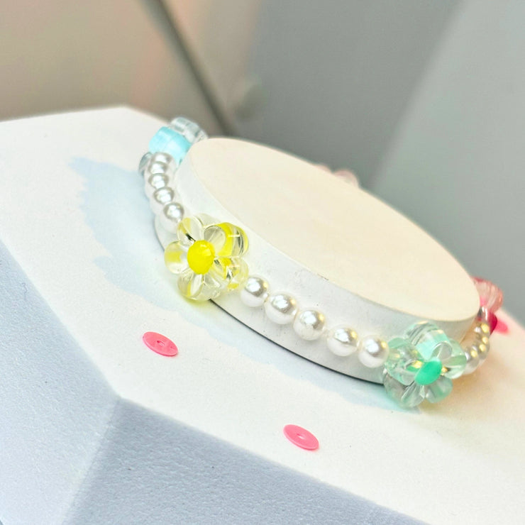 This delicate bracelet is made with transparent floral acrylic charms in pink, yellow, and green — each with a tiny centre button — placed on premium pearl-style glass beads. It’s like a mini bouquet around the wrist.