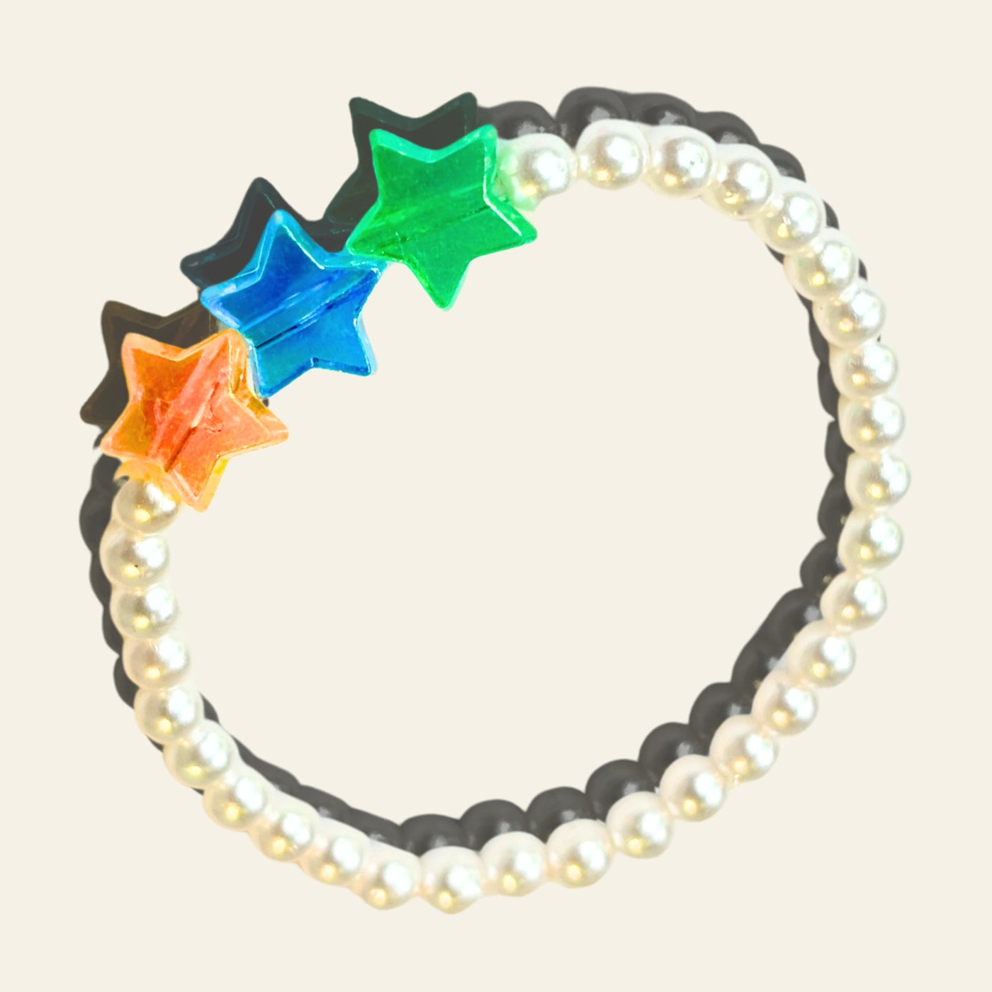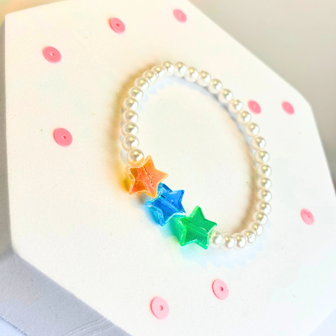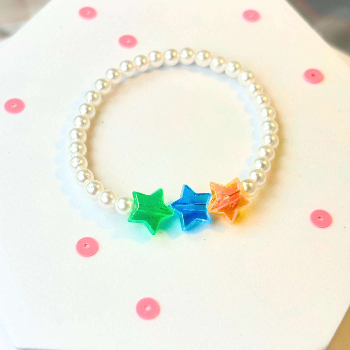 Starry-eyed style with acrylic star beads in rainbow colours —  orange, green, and blue — sitting on a band of pearl-like glass beads. Perfect for the kid who wants to shine bright.