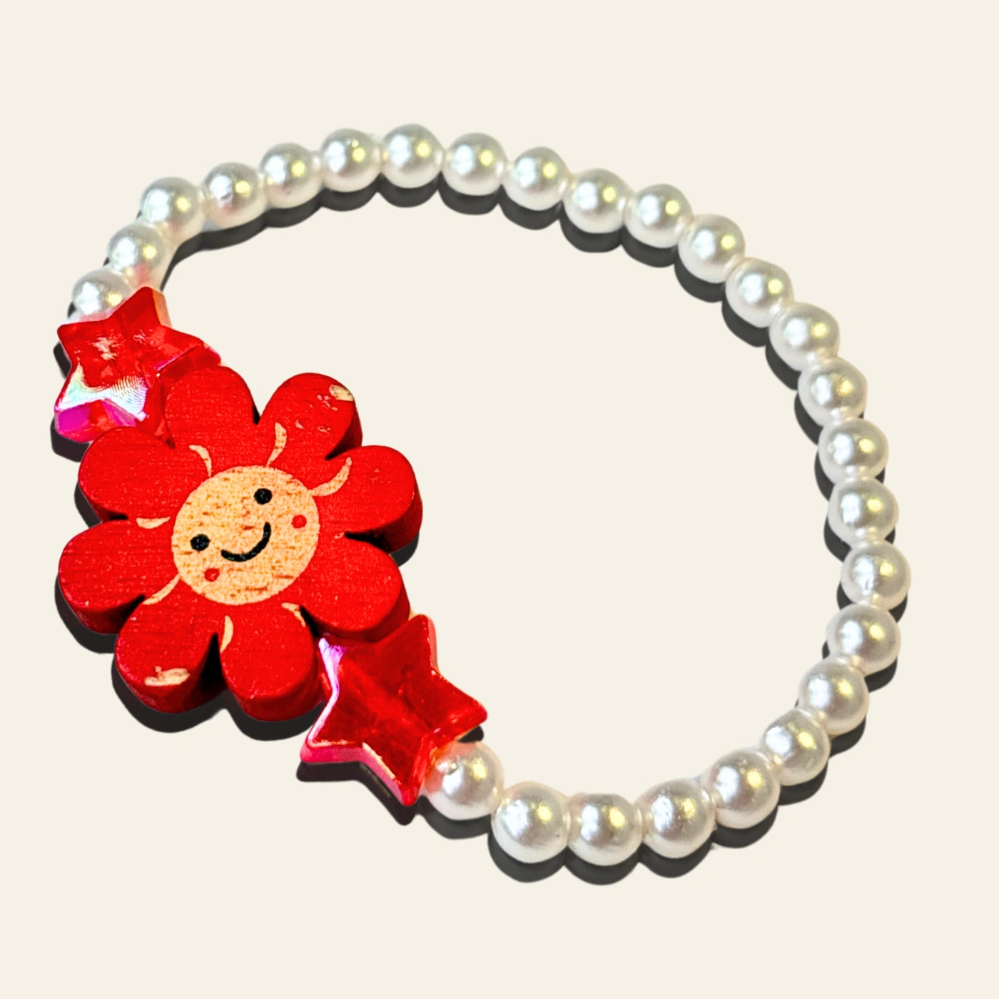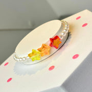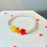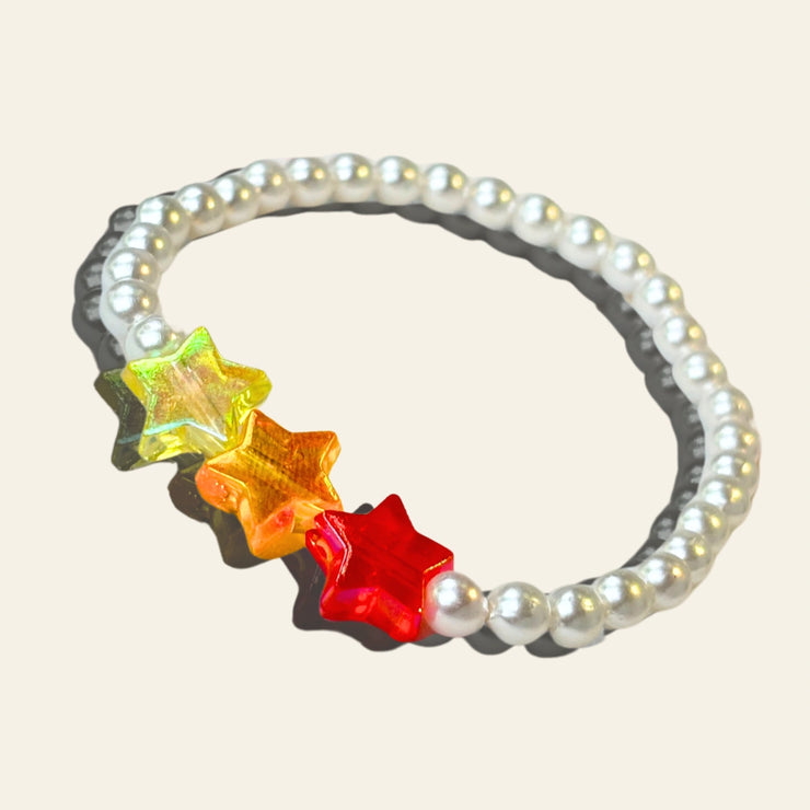 Warm-toned acrylic stars in amber yellow, bright orange, and ruby red create a fiery mix against a soft pearl like acrylic beads. This bracelet is pure bright energy — for little explorers.