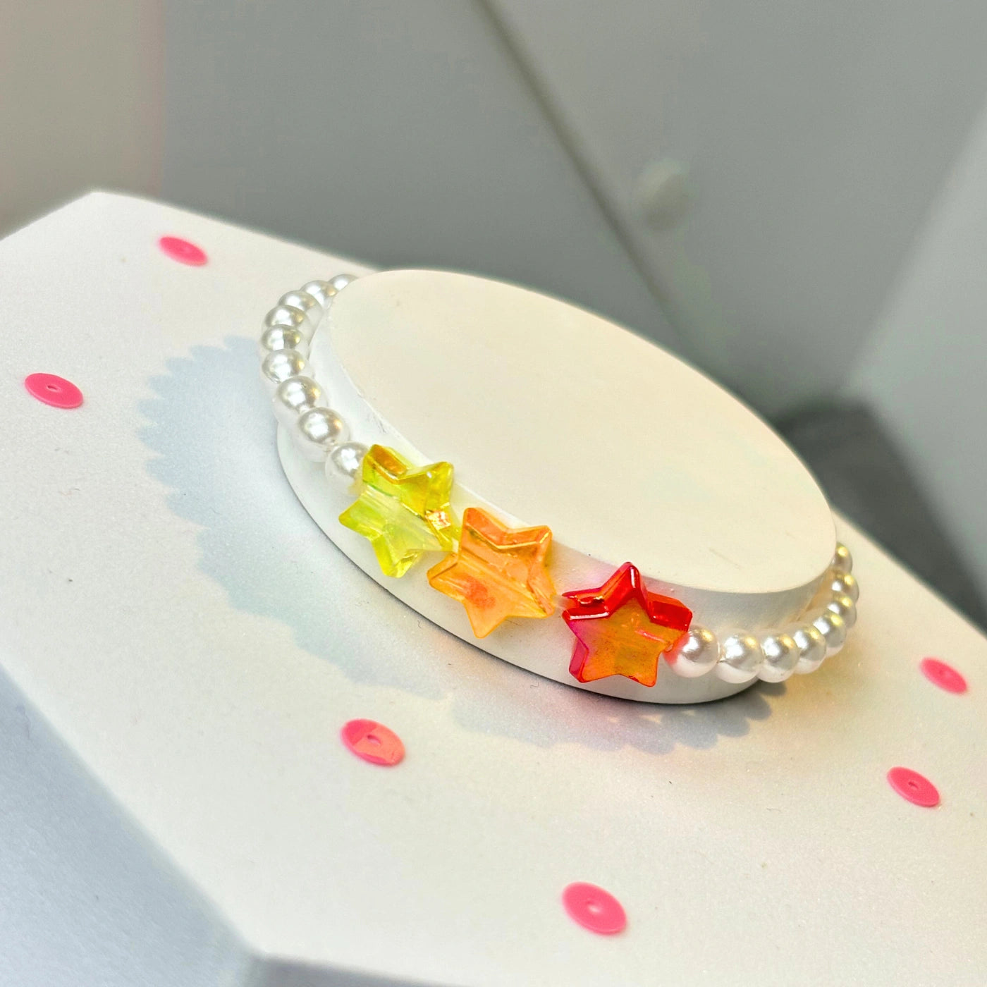 Bright, acrylic stars sit alongside glossy pearl-like beads for a balanced look that pops.