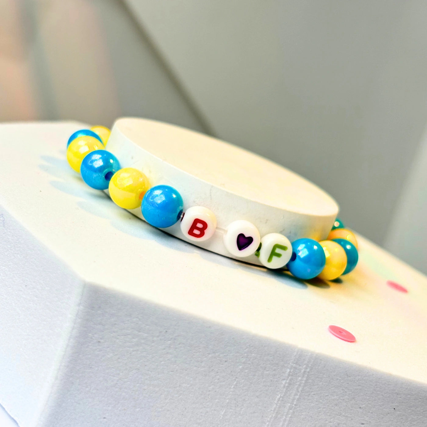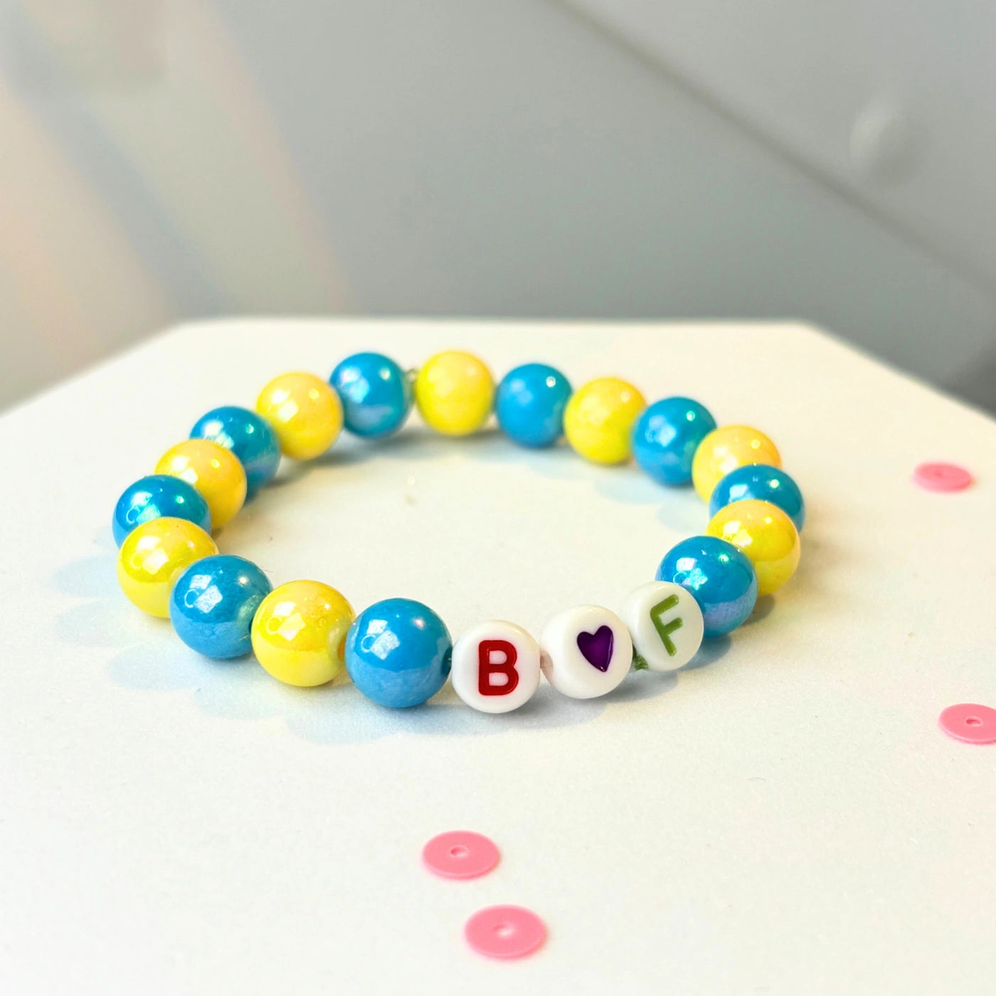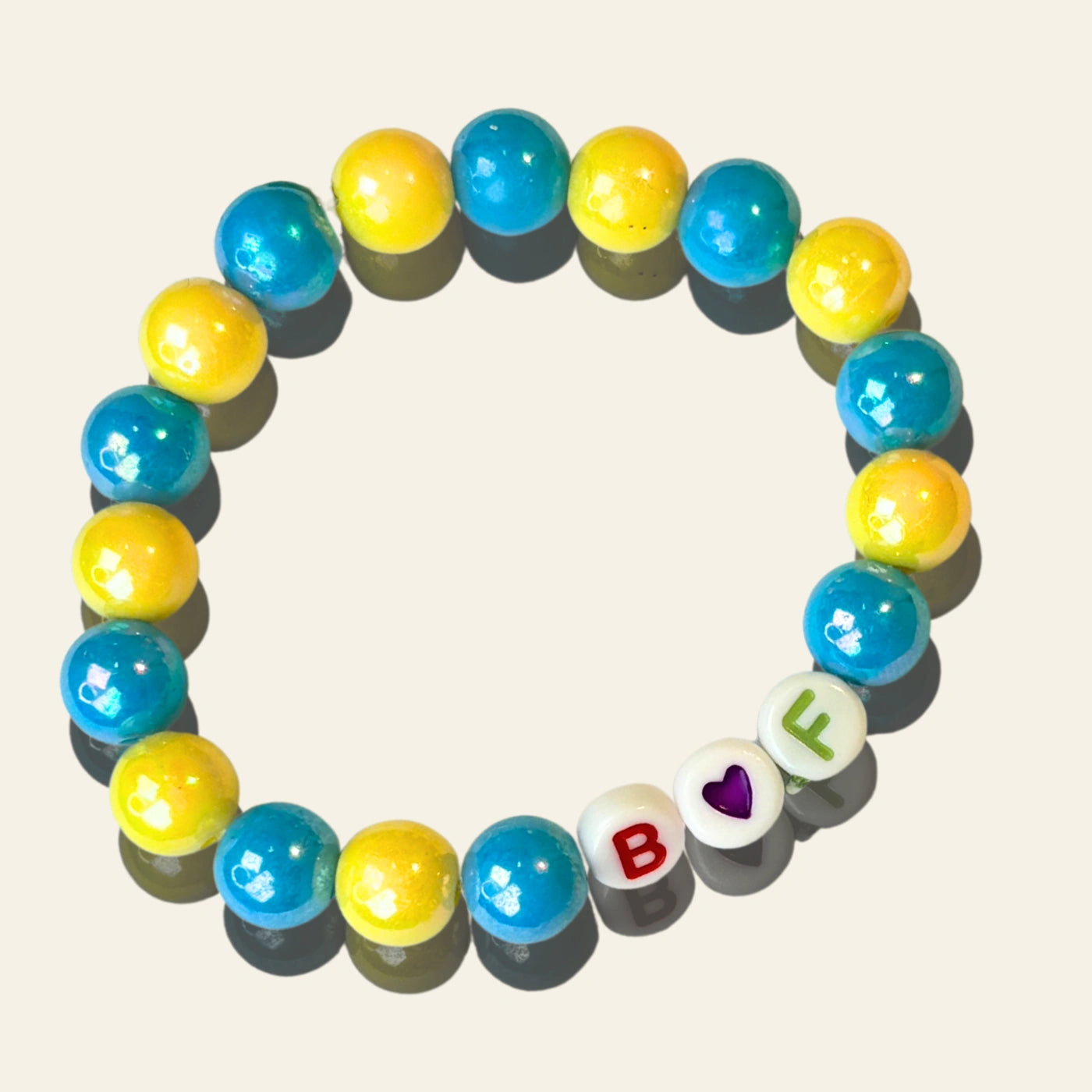Chunky, shiny beads in blue and yellow alternate around the wrist, paired with a fun letter bead spelling “B heart F.”