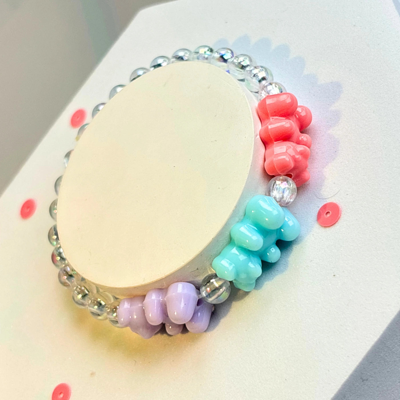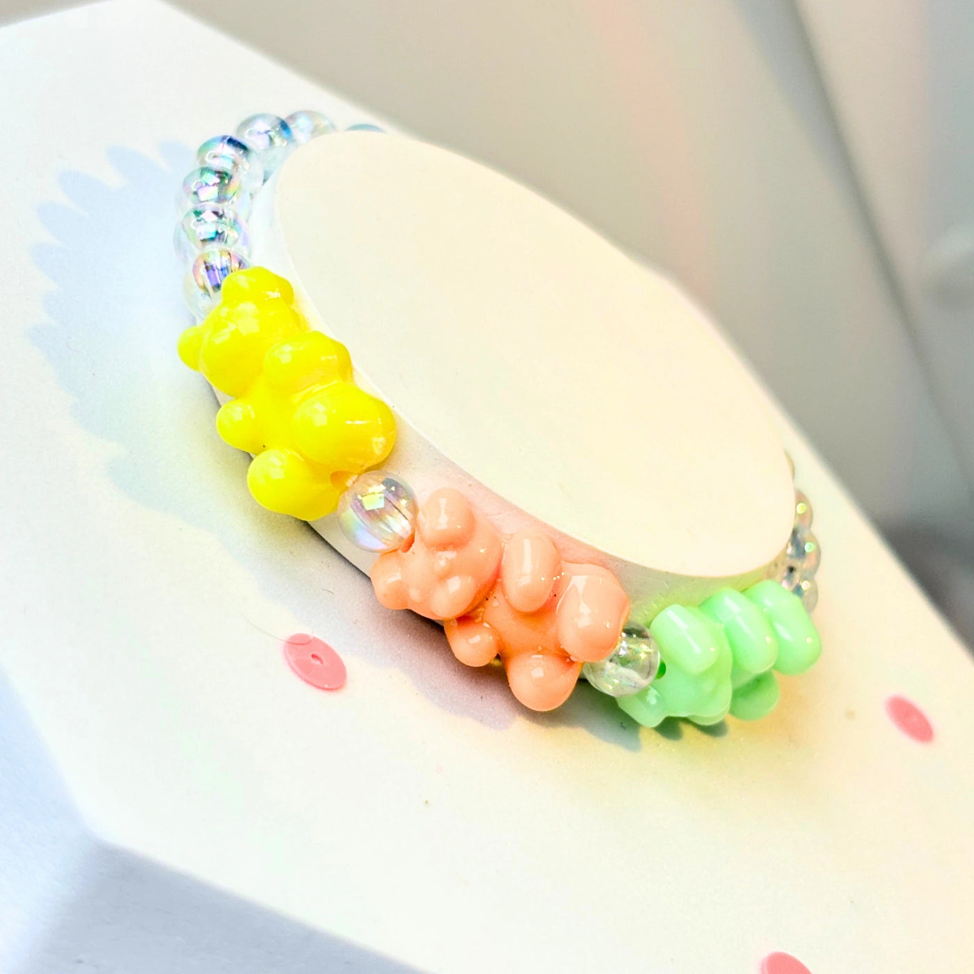 Iridescent clear beads add shimmer, while bold gummy bears pop in fun candy colours.