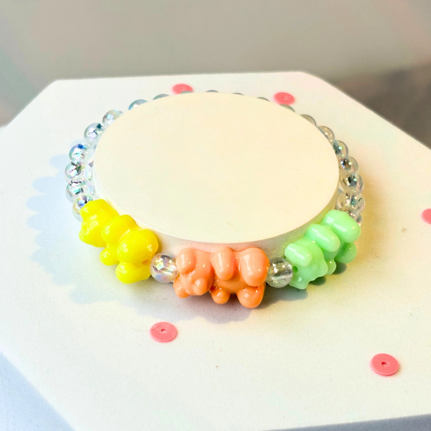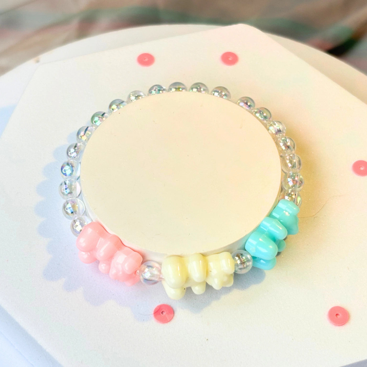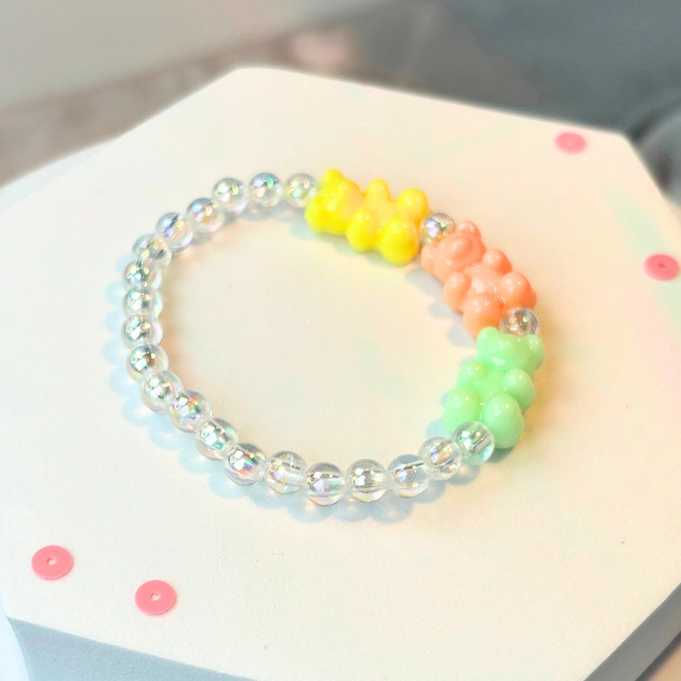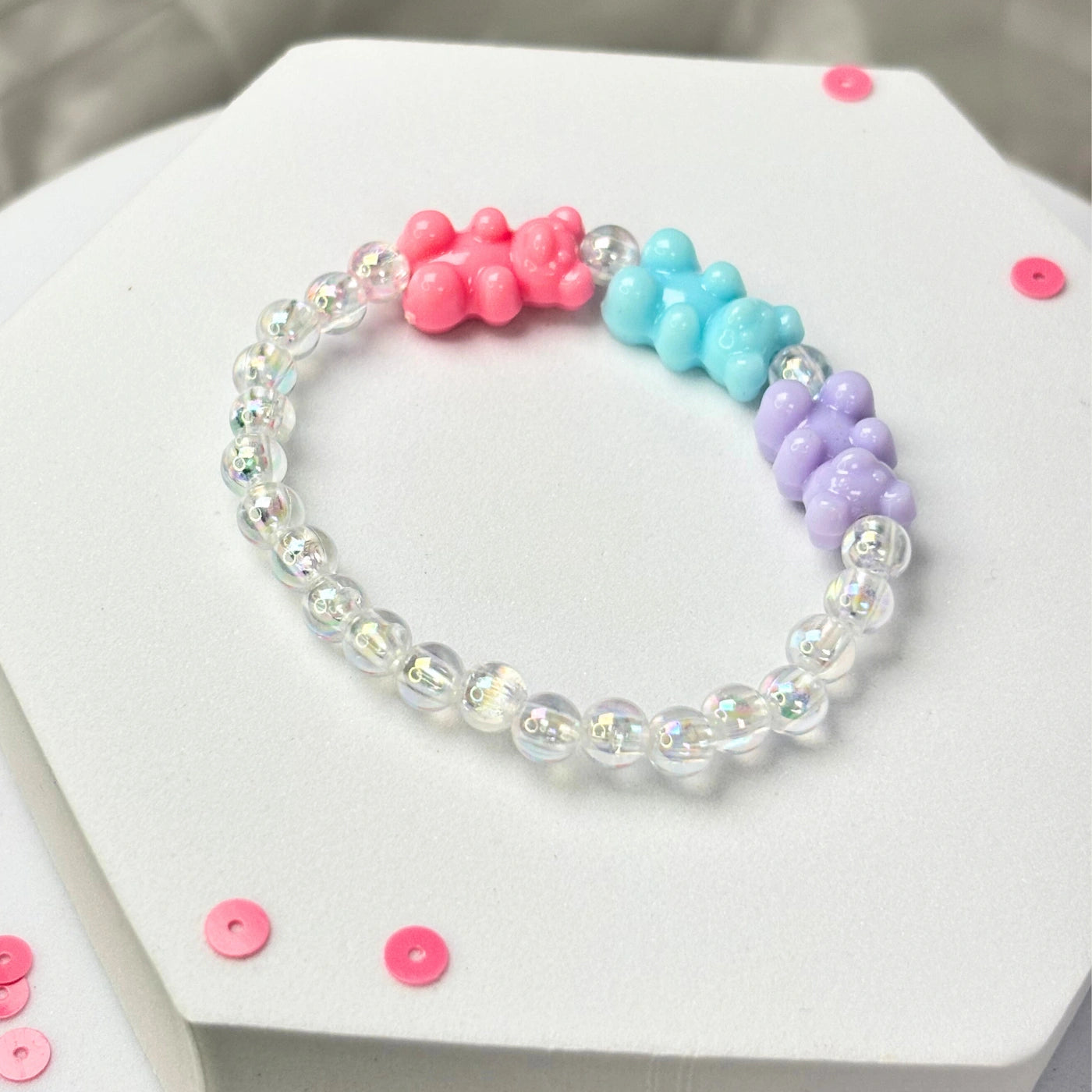 Clear round premium beads sparkle subtly, accented by baby pink, yellow, and blue gummy bear-style charms.