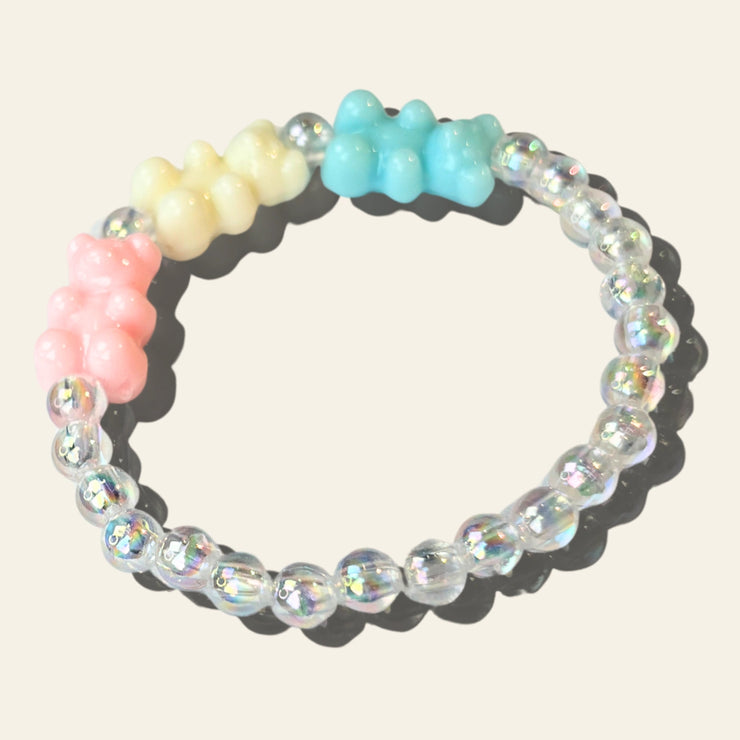 Pastel perfection with every bead — this bracelet features gummy teddy bear acrylic charms in baby pink, lavender, sky blue and soft yellow, set against shimmering translucent rainbow acrylic beads. A dreamy candy cloud on your wrist!