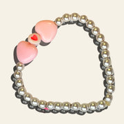 Made using premium metallic-look beads and two glossy pink acrylic hearts that make a bold statement in soft shades.