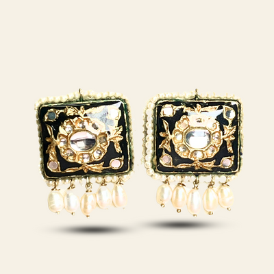 The Sitara Earrings are a bold and beautiful pair from our wedding collection. These statement earrings feature hand-painted Meena Kari work in classic black and gold, set with shining glass Polki stones and finished with soft white pearls.