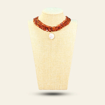 A striking combination of deep red orange Carnelian nuggets and luminous natural coin Pearls, this triple-layered choker is a blend of passion and grace. Created in the classic Dori style, it exudes elegance, making it a timeless accessory.
