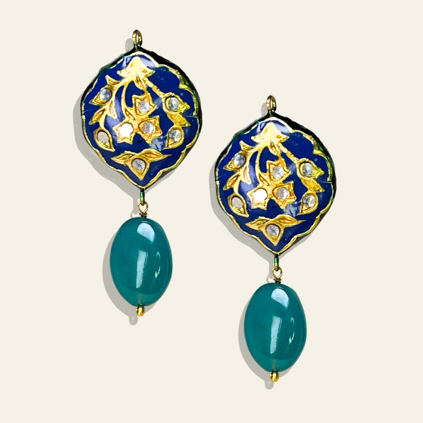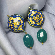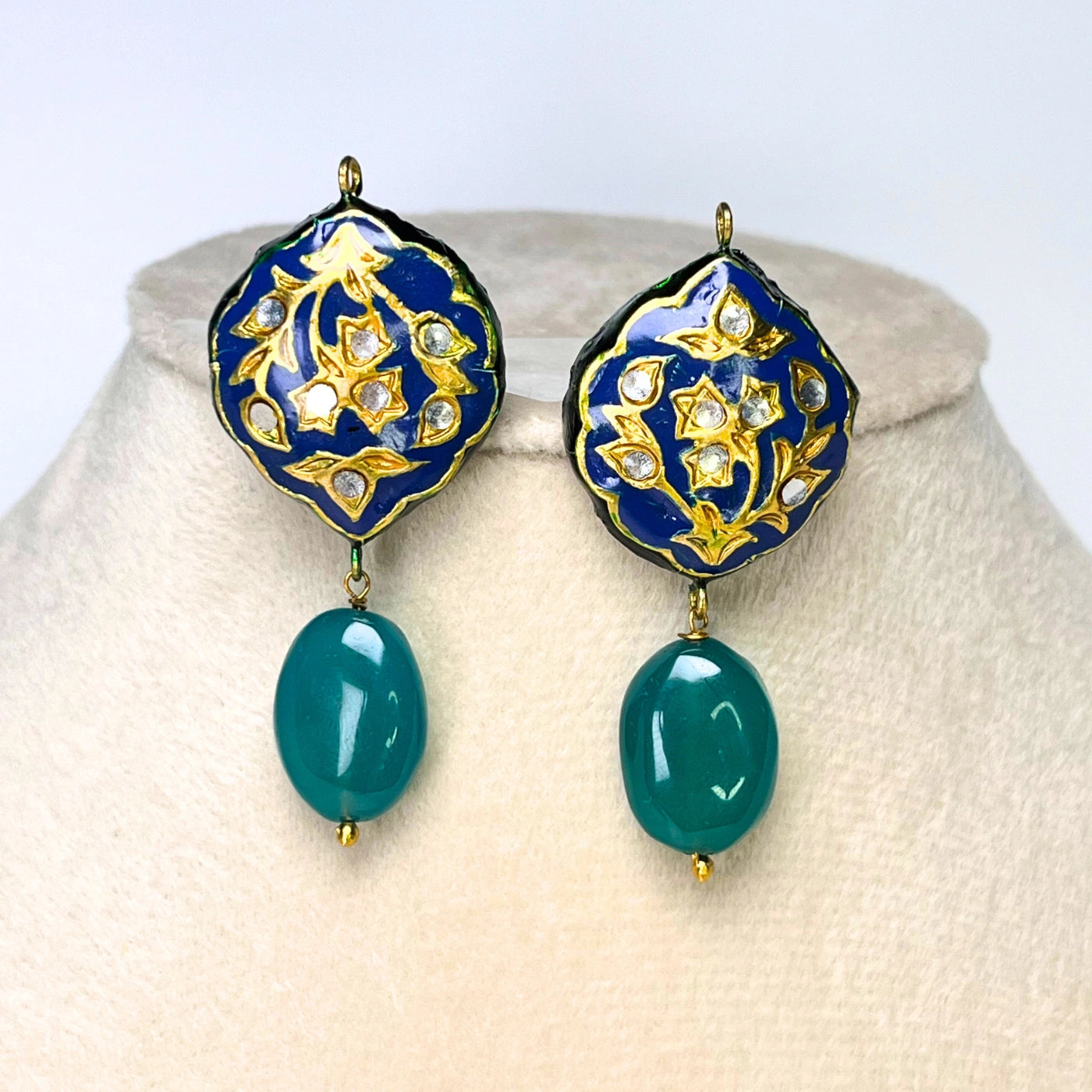 Royale Onyx Drops are striking statement earrings, hand-painted with rich navy blue and gold Meena Kari work. Accented with sparkling glass Polki stones and finished with single-drop green onyx beads, these earrings bring together tradition and elegance in perfect harmony.