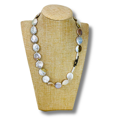 This refined necklace pairs pure white shell Pearls with genuine purple Amethyst tumble stones, secured with a sturdy clasp lock. The simplicity of the pearls and the richness of the amethyst create a timeless and versatile design.