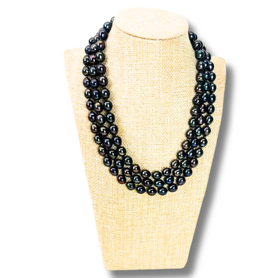 ‘Tuhina’ our stunning Black Pearl Choker,, this Triple Line choker is a masterpiece of design and craftsmanship. The Black pearls have a green sheen, are baroque (irregular shaped) and reflect a rainbow of colors – making this necklace rare and thus very valuable.