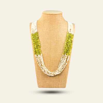 The Celestial Green Necklace brings together the protective power of green Peridot nuggets with multiple layers of golden and white seed beads. Known for its ability to ward off negativity and cleanse the aura, Peridot has been a symbol of protection for centuries.