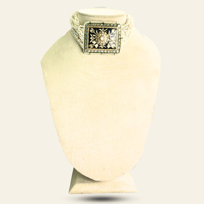 The Noor Choker is a bold and beautiful piece from our wedding collection. At its heart lies a striking statement pendant, hand-painted with traditional black and gold Meenakari work and connected by multi layered white and gold beads. Surrounded by delicate glass Polki stones, this choker brings together royal charm and timeless craftsmanship. The dori makes this piece adjustable to your liking.