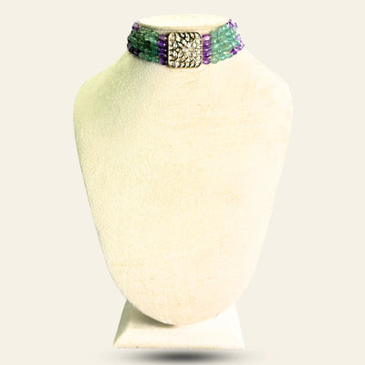 The Sitara Choker is a graceful and eye-catching necklace from our wedding collection. Made with fresh green Strawberry Quartz beads and deep purple Amethyst stones, this choker brings together beauty, colour, and a special meaning. The 5 layered semi precious beads makes this a statement piece.