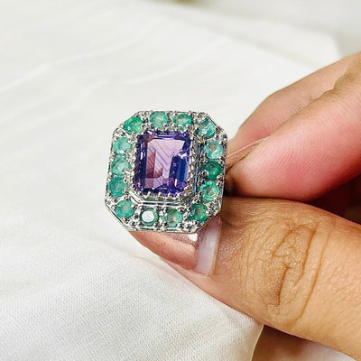 The beautiful hues of green Emeralds outline the baguette cut Amethyst stone, set in the middle. The ring is made in 925 silver and is rhodium coated to ensure it does not tarnish. The rhodium coating provides an additional layer of protection to your ring to ensure its longevity.