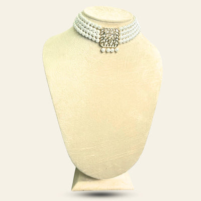 Necklace with brown and white beads on a beige mannequin bust_ tiger eye beads_tribal and contemporary