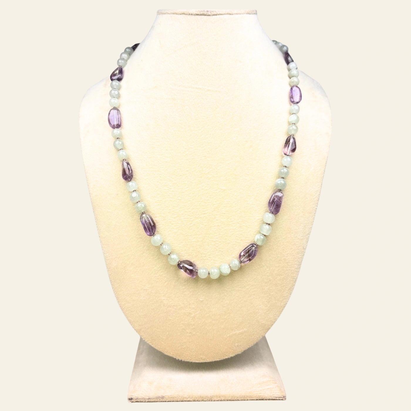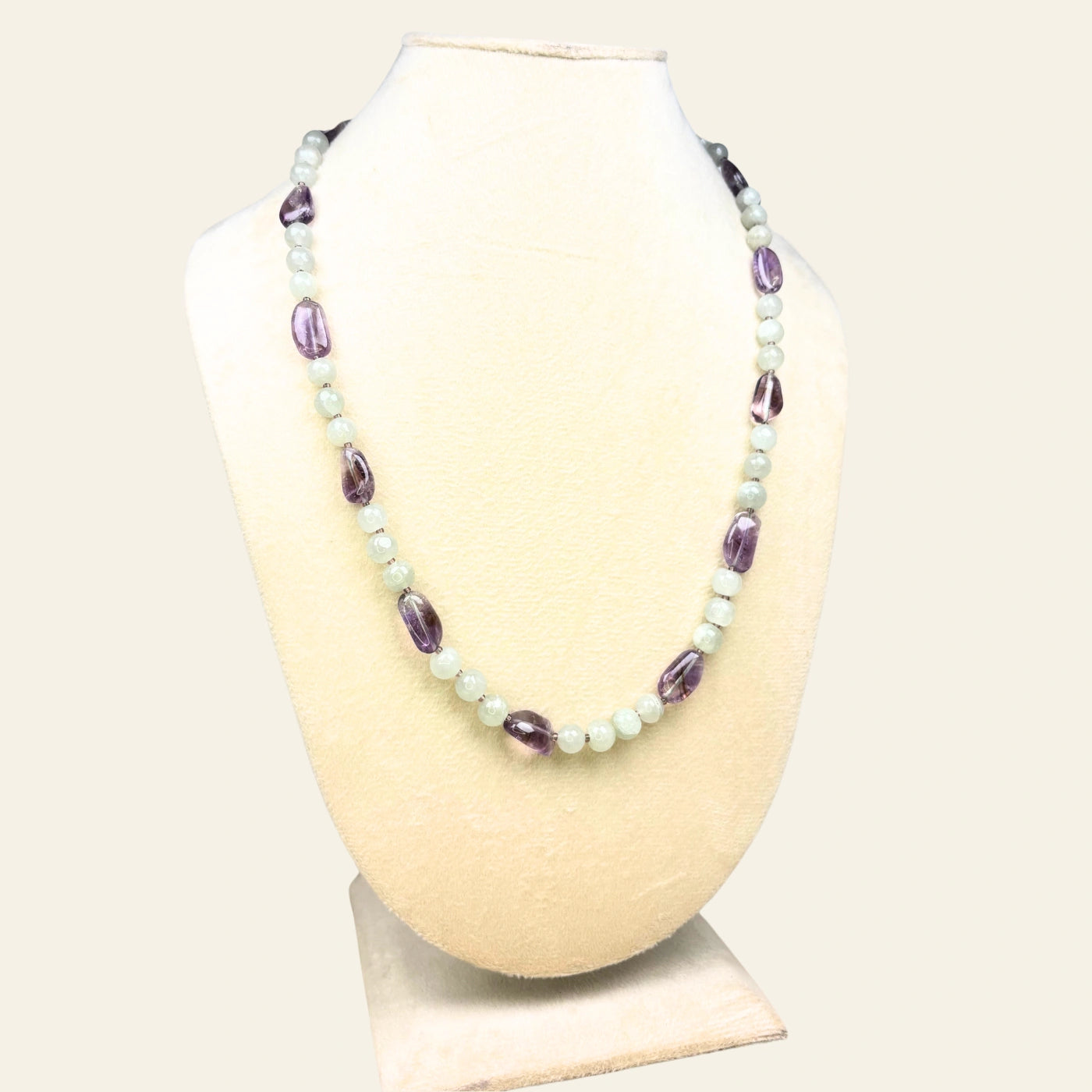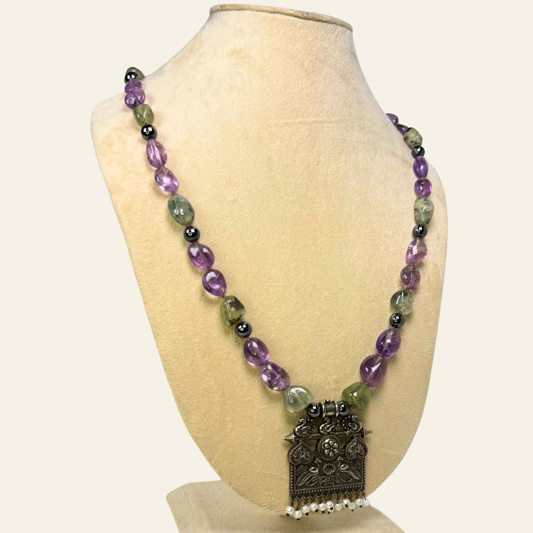 Forest Oracle channels ancient forest wisdom — steady, intuitive, and quietly protective. The amazonite donut at its center brings calm to emotional turbulence and opens the heart to clearer expression. Tiger’s eye adds grounded strength and sharp focus, stabilizing your intentions. The deep black onyx bead anchors the piece, absorbing negativity and enhancing emotional resilience. A finishing touch of lapis lazuli introduces wisdom and clarity of thought.