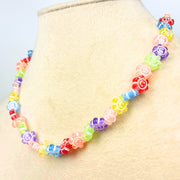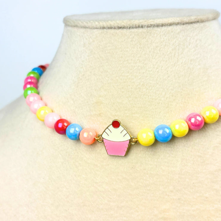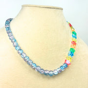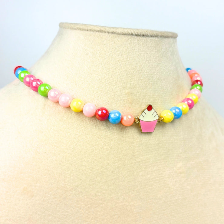 Necklace with multicolored beads and an ornate pendant on a beige stand.