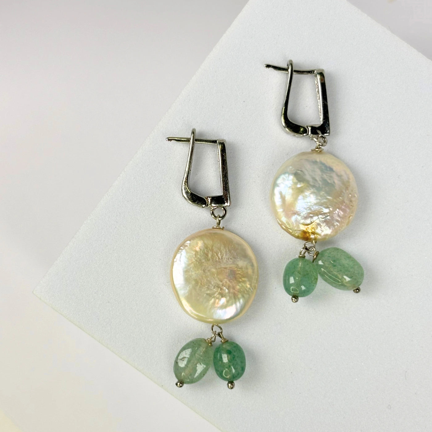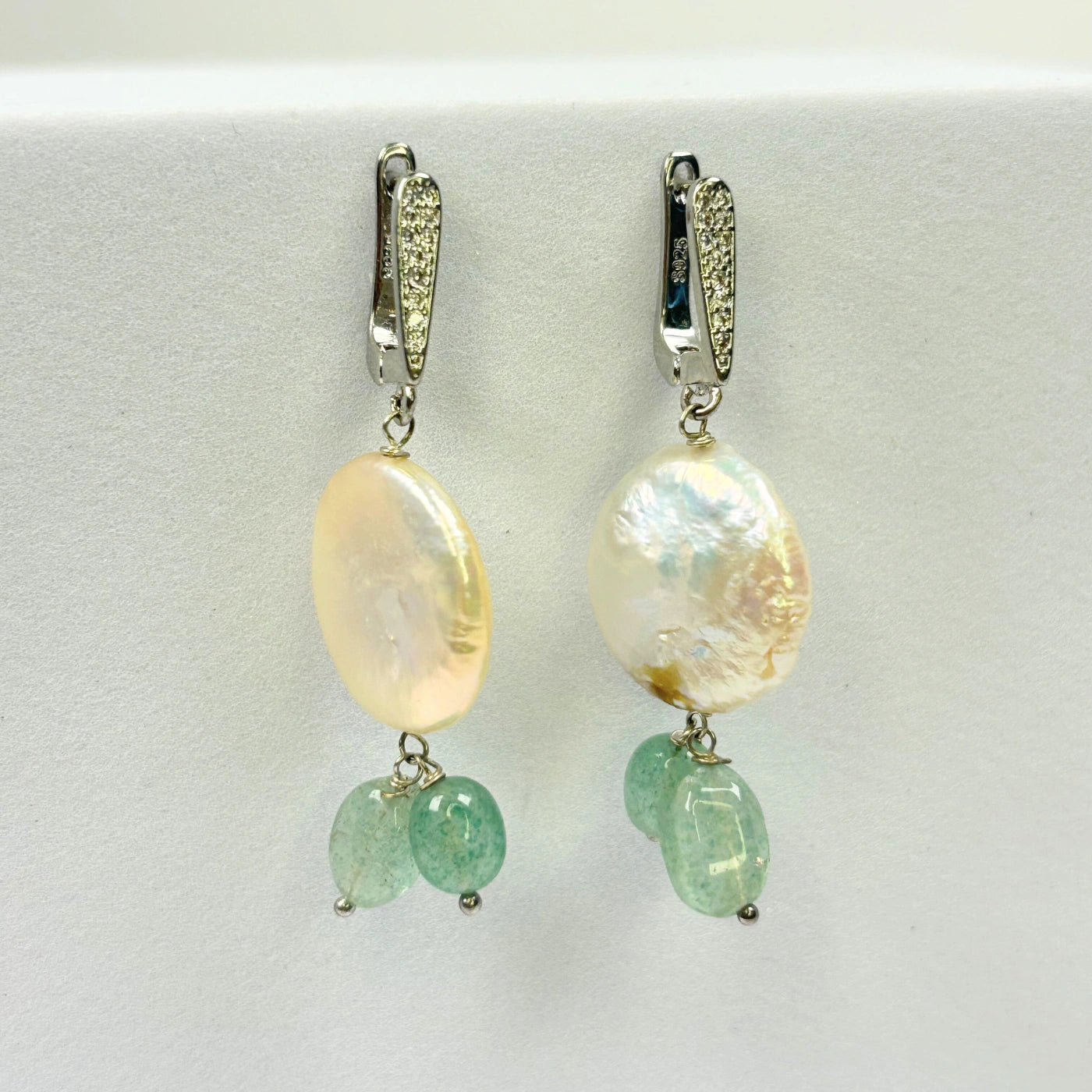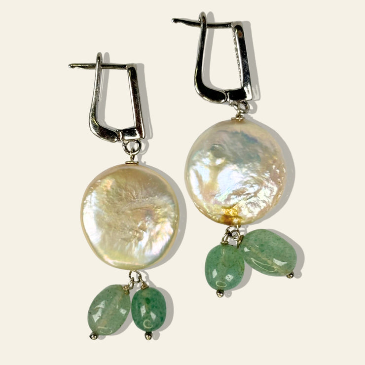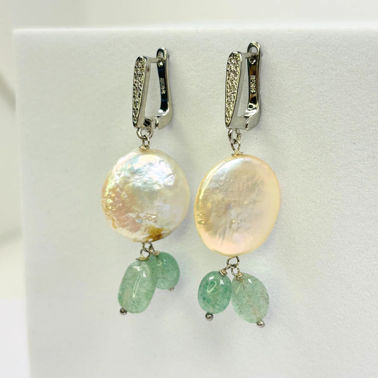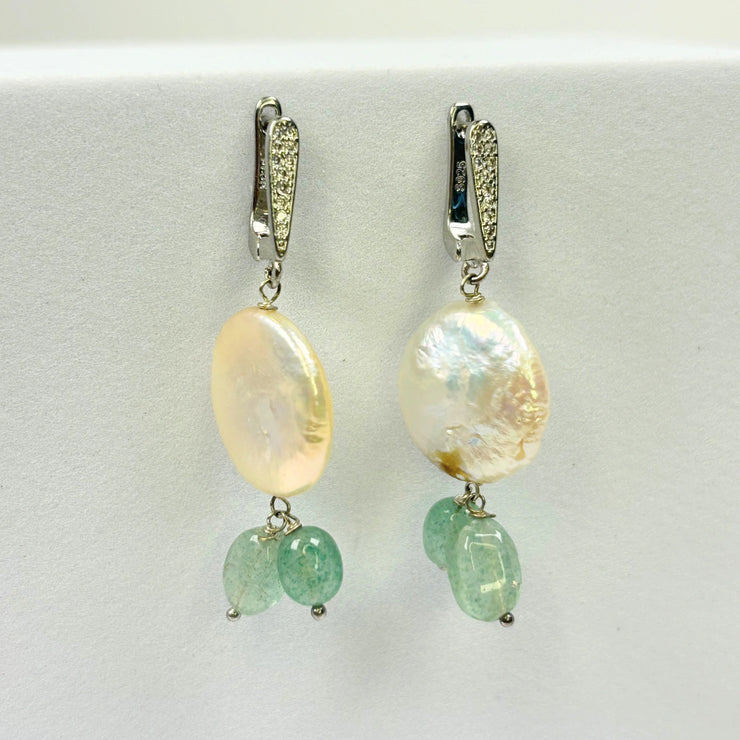 Soft, serene, and irresistibly elegant — the Sea Whisper Earrings feature natural baroque coin pearls paired with green strawberry quartz stones and stain steel pavé-studded hooks. The gentle shimmer of pearls meets the beautiful tones of ocean-like green, bringing freshness to your look.