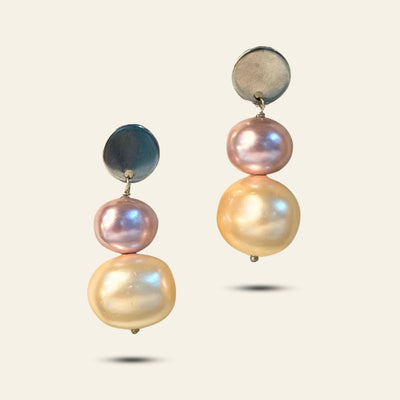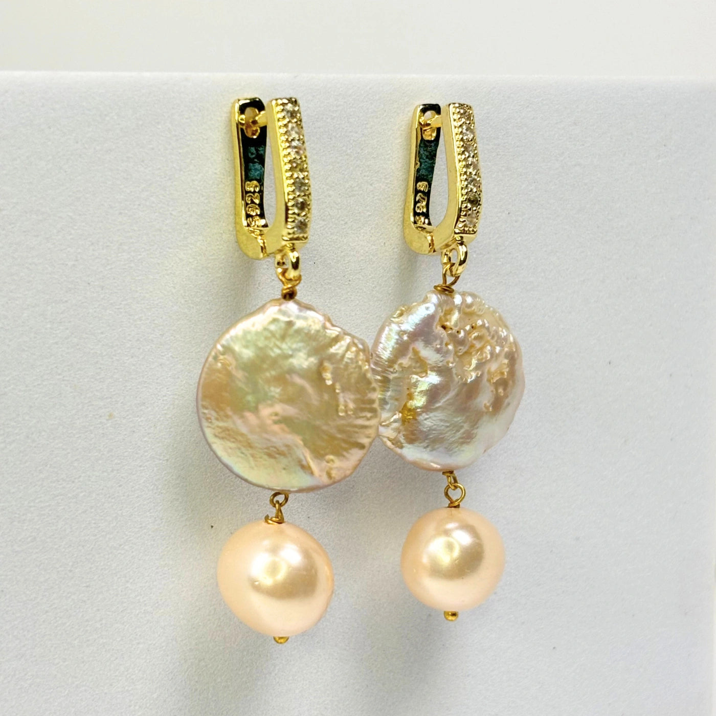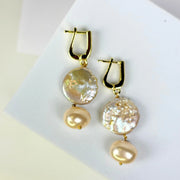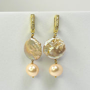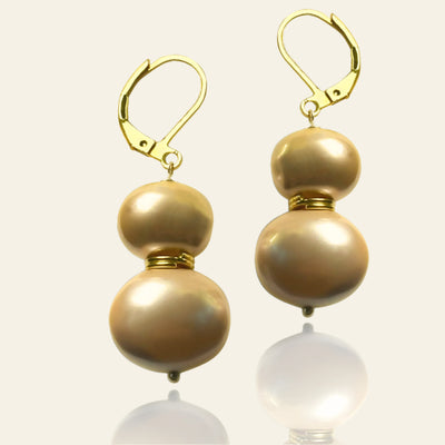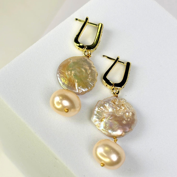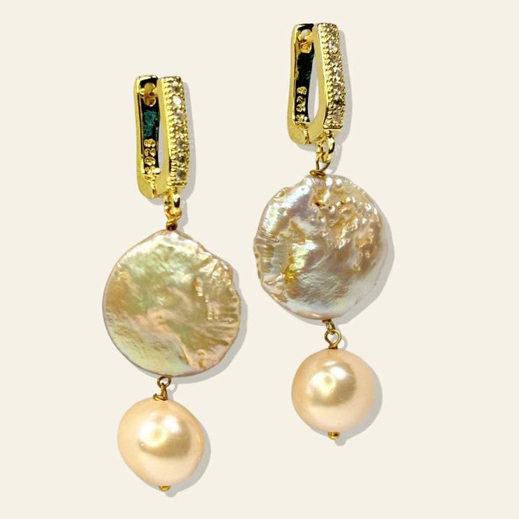 An effortless classic with a sunset glow — the Golden Beach Earrings combine the luminous beauty of natural baroque coin pearls with creamy round pearls, suspended from stainless steel gold-tone pavé hooks. Understated yet unmistakably elegant, this piece offers an instant glow-up to your wardrobe.