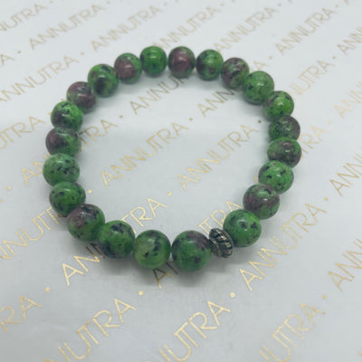 The ‘Carmine’ bracelet is made of the finest Ruby Zoisite stones with a gorgeous hand engraved German silver stopper. Each bead is 6 mm in size.
