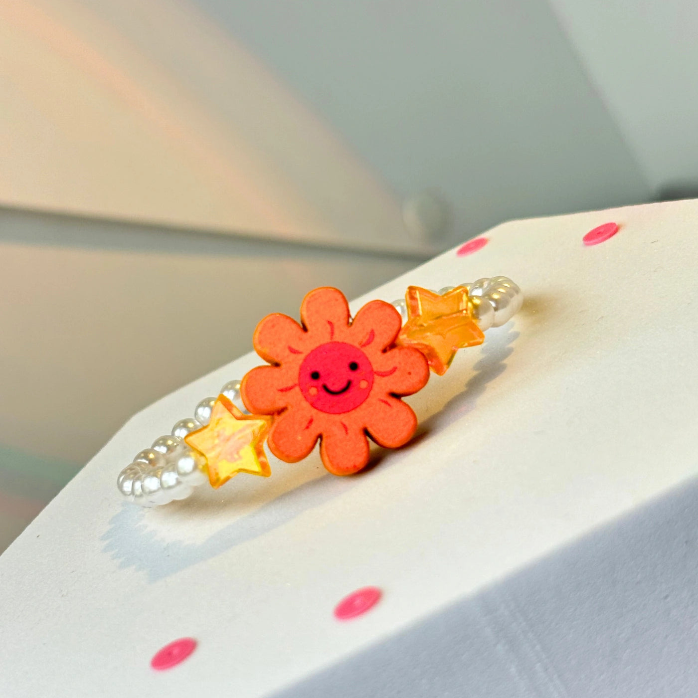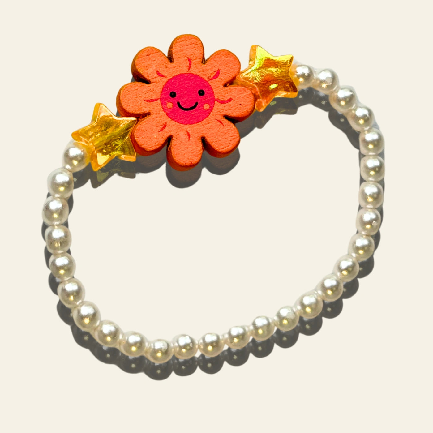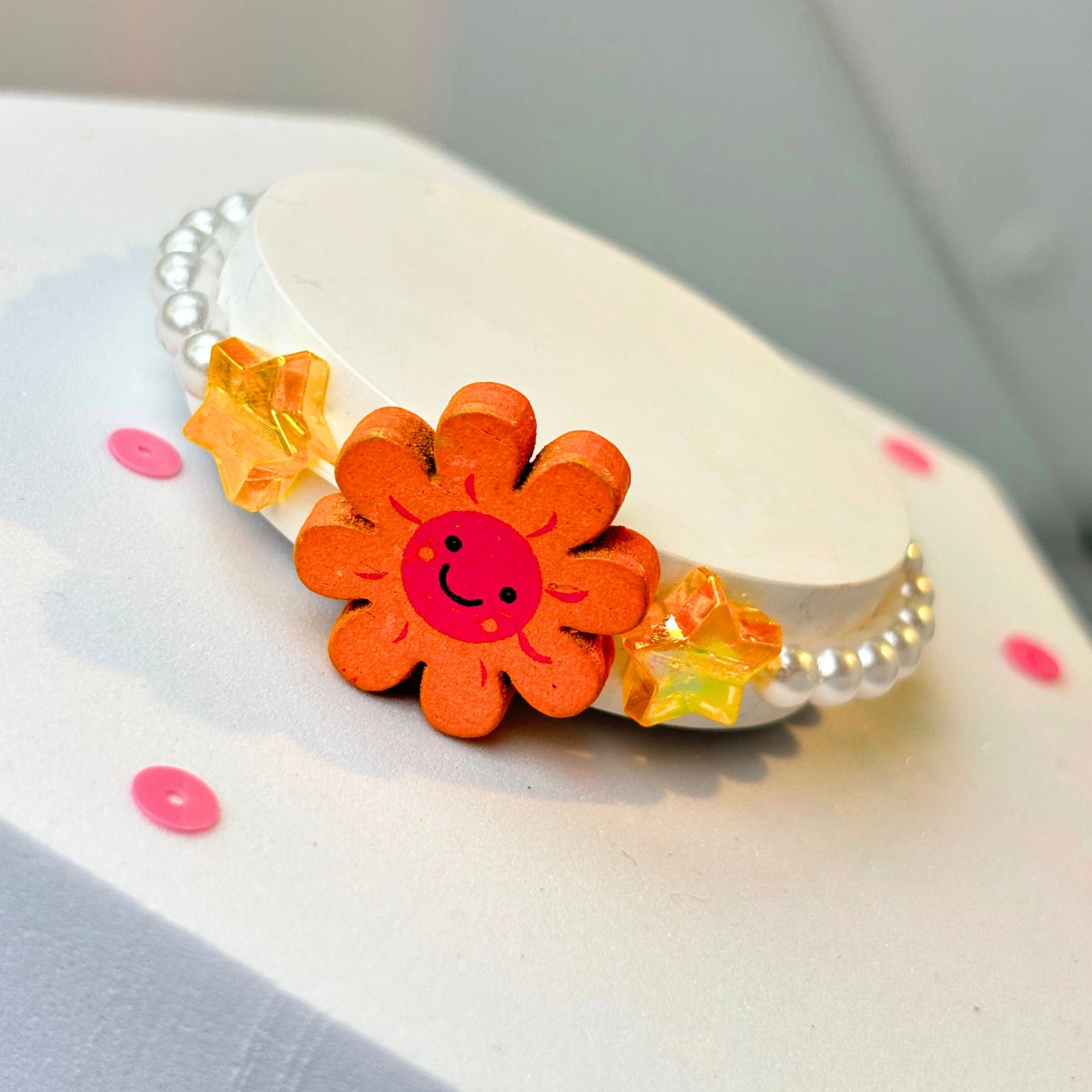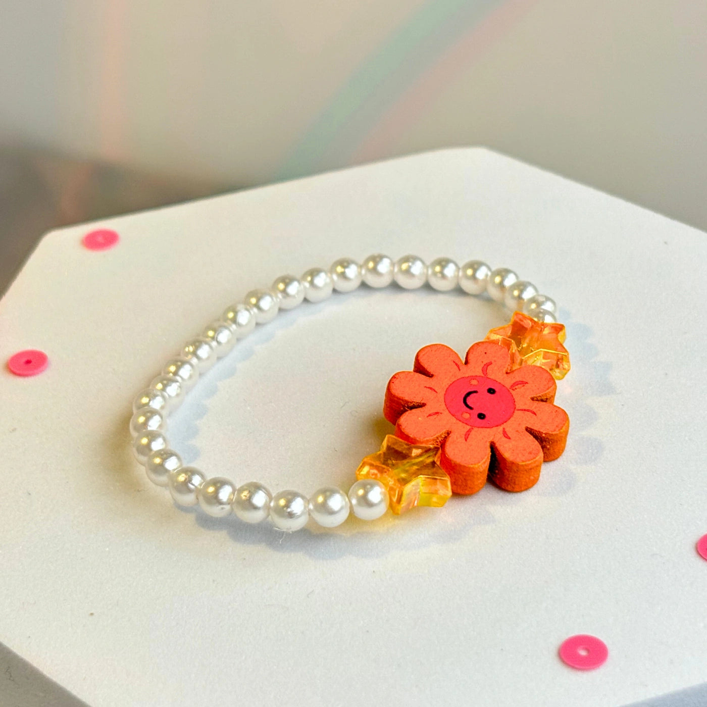 Sunny Bloom Bracelet +  pop +  sunshine + orange + acrylic + wooden + flower + charm + acrylic star + beads + and  + glossy white pearl + beads + Bracelet + soft + acrylic + shaped beads + charm + rainbow + acrylic + bead + love + kids + child + girl + jewellery + princess + vibe + summer + elastic + annutra