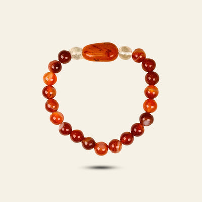 The Vitality Carnelian Bracelet is designed with a blend of round and tumble-shaped Carnelian beads, flanked by clear White Quartz beads.